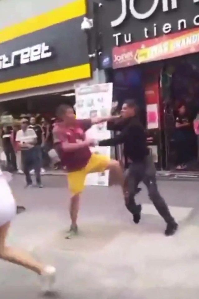 The adult star knocks his rival to the ground before repeatedly striking his head as dozens of passerby watch on.