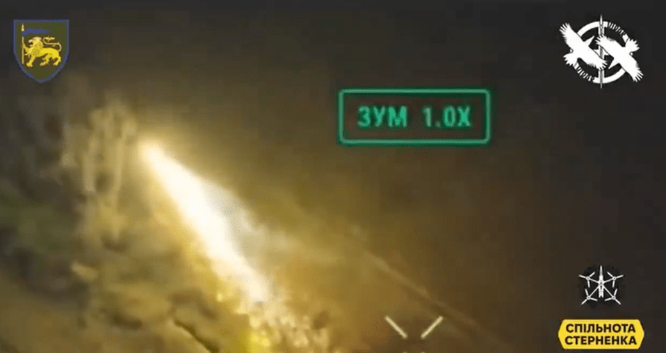 STUNNING footage has captured the moment a Ukrainian “dragon drone” spits out a fiery stream of thermite on a Russian-held treeline.