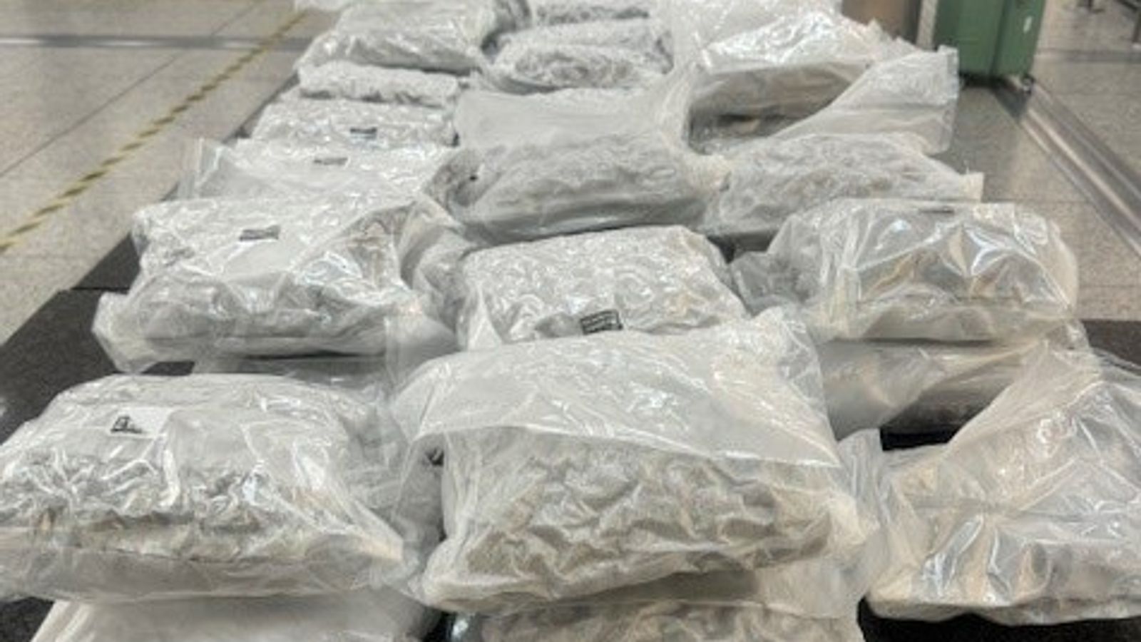 Border Force officers were said to have found 60kg of cannabis in two suitcases which had arrived on a flight from Bangkok.