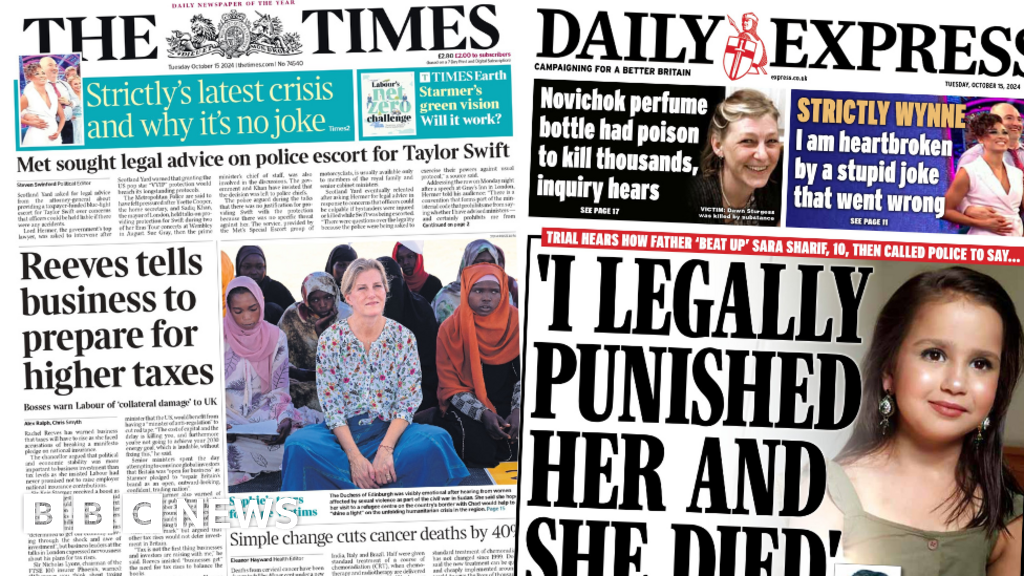The Times’ take on the same story leads with business heads warning the chancellor of anticipated “collateral damage” to the UK, following the proposed rise in business taxes. Also on the front is a piece saying Scotland Yard sought legal advice about providing a police escort for Taylor Swift during two of her Eras Tour concerts at Wembley in August.