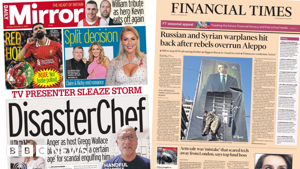 The Daily Telegraph, too, features Wallace’s outburst on its front page, as well as a political piece on the prime minister, whom it reports will “sideline his flagship pledge to make the UK the fastest growing economy in the G7”. Instead, the paper says, Sir Keir Starmer will reveal different economic targets “aimed at improving living standards”. Elsewhere on the Telegraph’s front page is a report on Syrian President Bashar al-Assad vowing to “crush a rebel uprising” that took control of the city of Aleppo.
