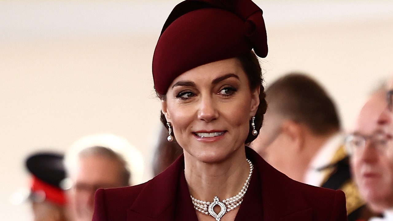 The occasion for her burgundy ensemble was a visit to London by the Emir of Quatar, Tamim bin Al Thani, and his wife, Jewaher bint Hamad bin Suhaim Al Thani. Kate Middleton welcomed them along with Prince William and King Charles, and together they attended the Horse Guards Parade. The Princess of Wales wore a refined coat dress by Alexander McQueen, a matching hat by Sahar Millinery, leather boots and gloves, and her favorite Chanel handbag.