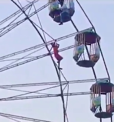 To get to safety, the girl had to descend with the turning of the wheel with her full weight resting on her upper body as the wheel turned her upside-down.