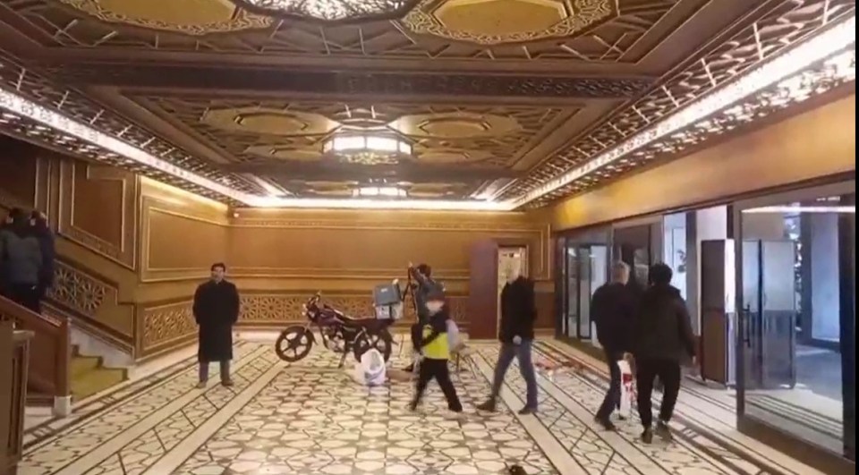 A grand hall inside the property was left in disarray as tables, chairs, and papers were scattered and dashed across the room.