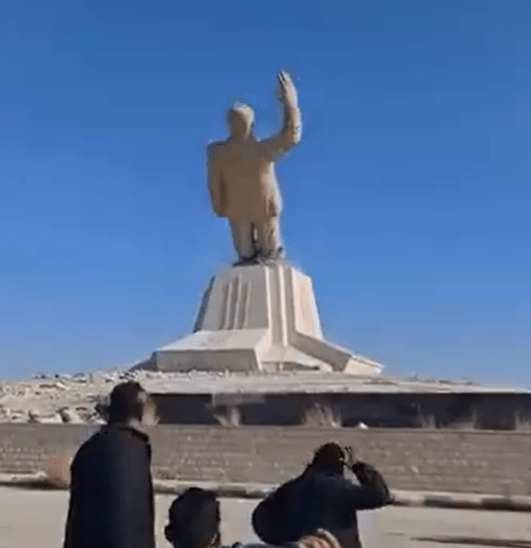 A giant monument honouring former president Hafez al-Assad – the dad of overthrown dictator Bashar al-Assad – was dragged to the ground today as hundreds celebrated.