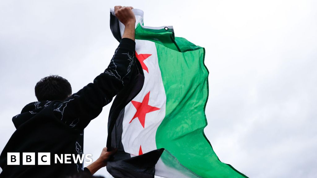 A man waves a Syrian opposition flag to celebrate the end of al-Assad rule