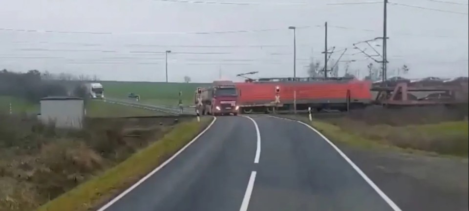 The dramatic video showed the nearly catastrophic aftermath when a truck became stuck on a crossing in the Börde district, around 100 miles west of Berlin.