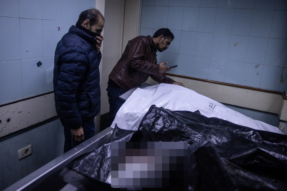 GettyWomen look at a body bag inside the morgue in Syria[/caption]