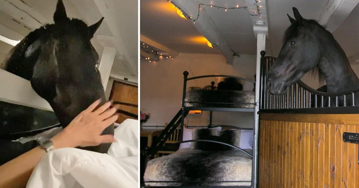 Guests can sleep over in a room shared with either a Friesian horse, or a little Shetland pony, separated by a divider.