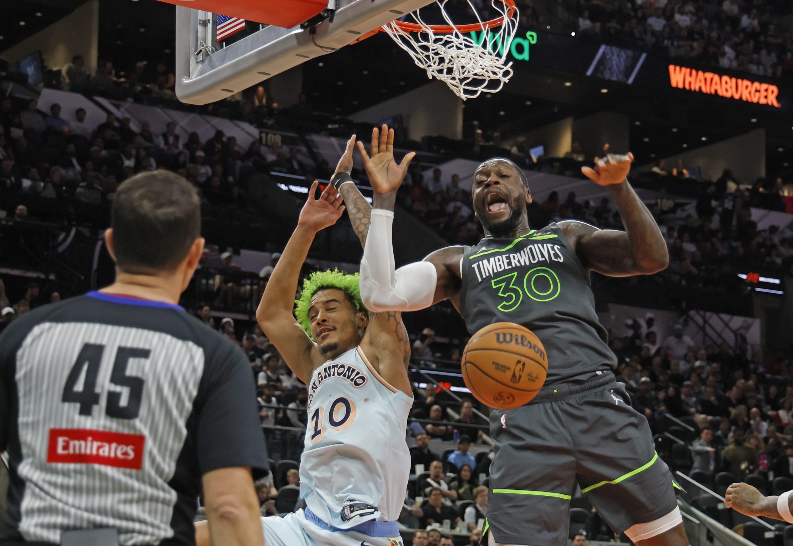SAN ANTONIO, TX – DECEMBER 15: Julius Randle #30 of the Minnesota Timberwolves dunks over Jeremy Sochan #10 of the San Antonio Spurs in the first half at Frost Bank Center on December 15, 2024 in San Antonio, Texas. NOTE TO USER: User expressly acknowledges and agrees that, by downloading and or using this photograph, User is consenting to terms and conditions of the Getty Images License Agreement. (Photo by Ronald Cortes/Getty Images)