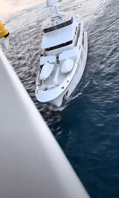 Footage shows the 121-foot superyacht veering at a diagonal angle toward the 225,000-ton cruise liner, slamming into its side with a sickening crunch before scraping along the hull.