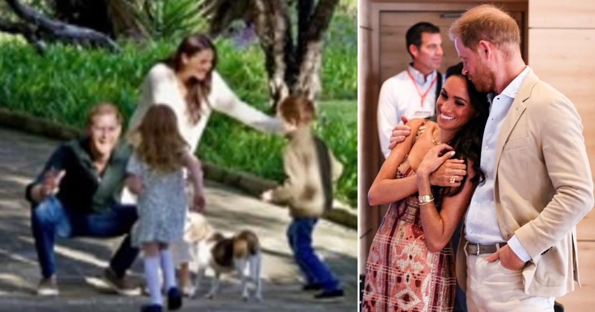 At the centre is a picture of Harry and Meghan with the children running to their open arms while their three dogs keep watch nearby.