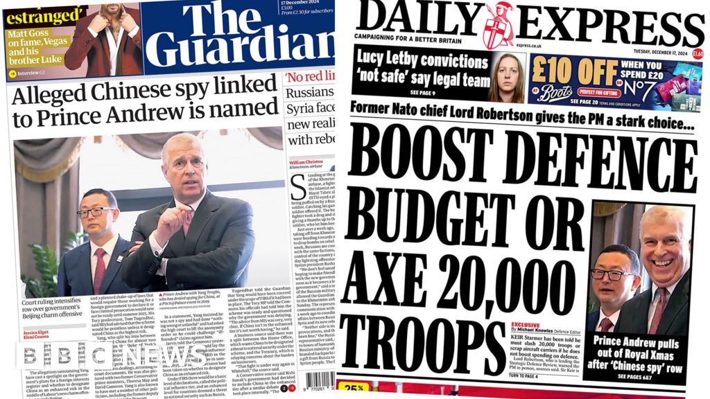 The story of the alleged Chinese spy linked to Prince Andrew continues to dominate the front pages. Metro leads on the naming of the spy suspect as Yang Tengbo – also known as Chris Yang – who asked for a court order anonymising him to be lifted so that he could deny the allegations against him.