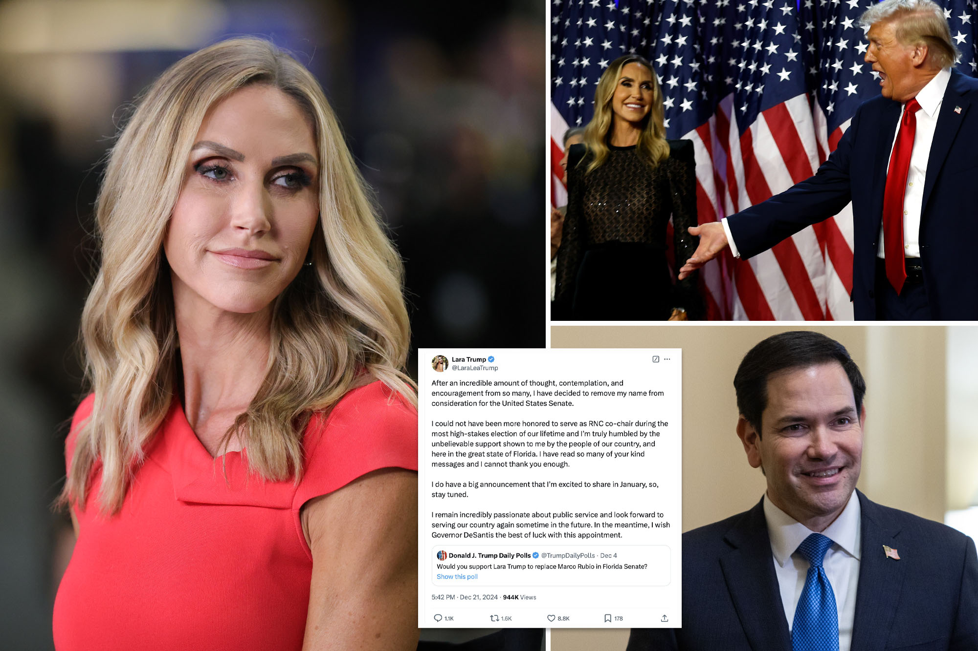 Lara Trump, the daughter-in-law of President-elect Donald Trump, said has withdrawn her name from consideration to replace outgoing Florida Republican Sen. Marco Rubio, as she teased a “big announcement” next month.