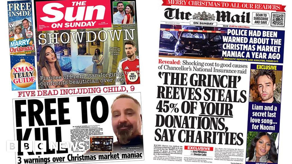 Most of Sunday’s newspapers report that the Saudi doctor suspected of driving a car into a busy Christmas market in Magdeburg, Germany, had warned on social media that something big was going to happen. “Free to kill” is the headline of the Sun on Sunday. The Mail on Sunday describes him as a softly spoken psychiatrist, who was unfailingly polite in his brief exchanges with his neighbours, while expressing a kaleidoscope of paranoiac views in his posts on social media.
