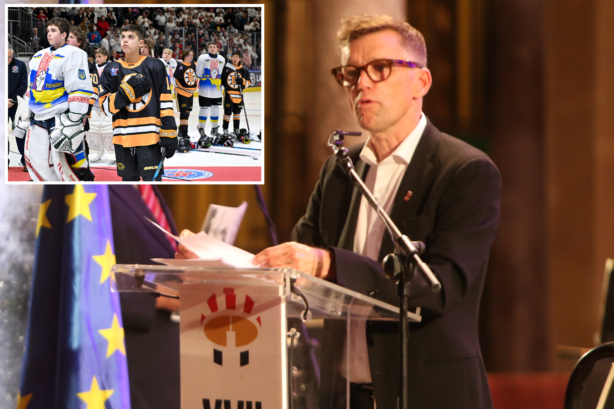 Peewee teams stand together during the national anthems before a hockey game in Quebec. AP