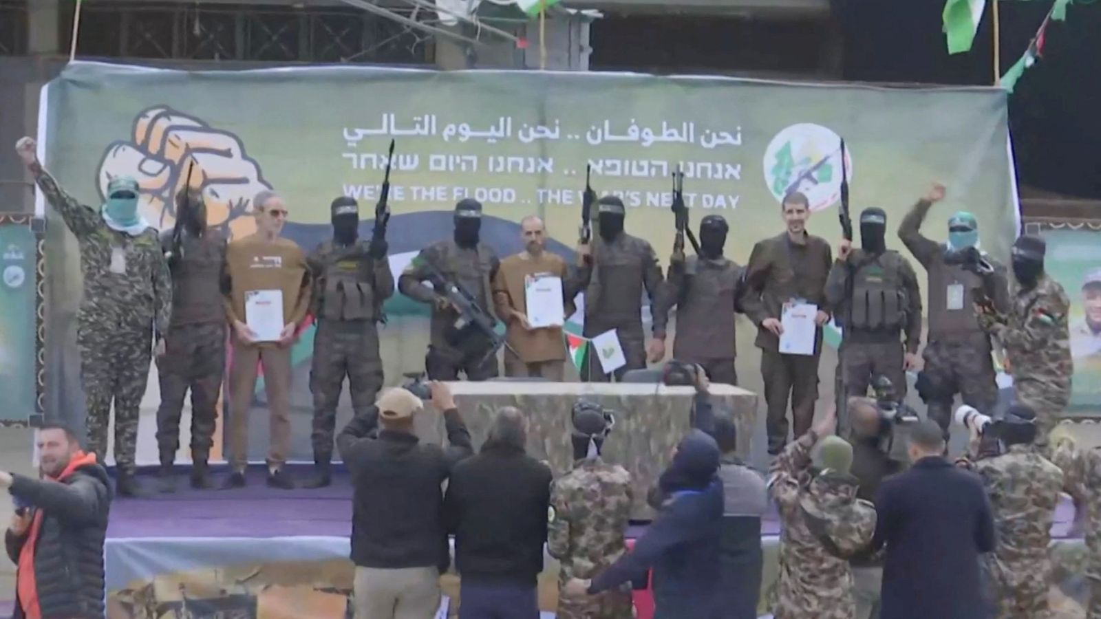 The Israeli hostages, who appeared thin, were paraded in front of dozens of masked and armed Hamas fighters, as well as a small crowd of onlookers.