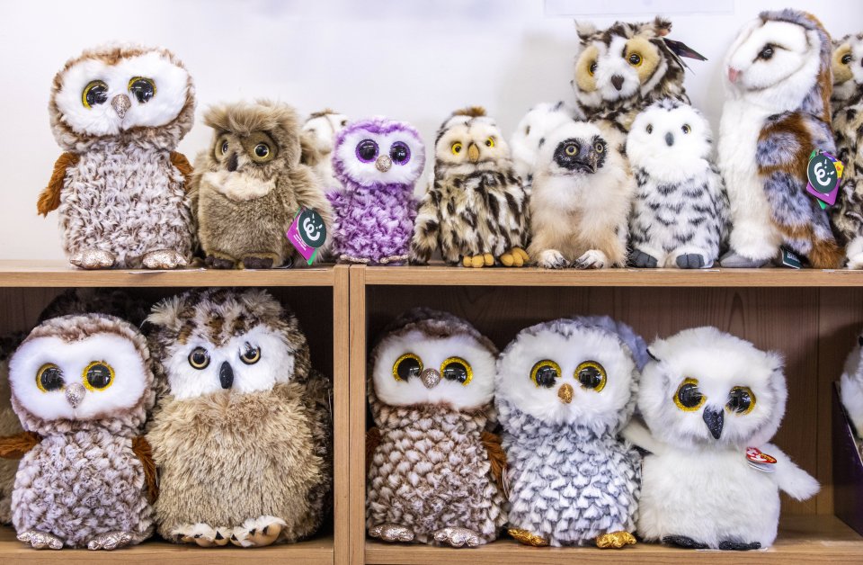 Stood among these toys is a five-week old real owl, pictured when it was born in 2022.