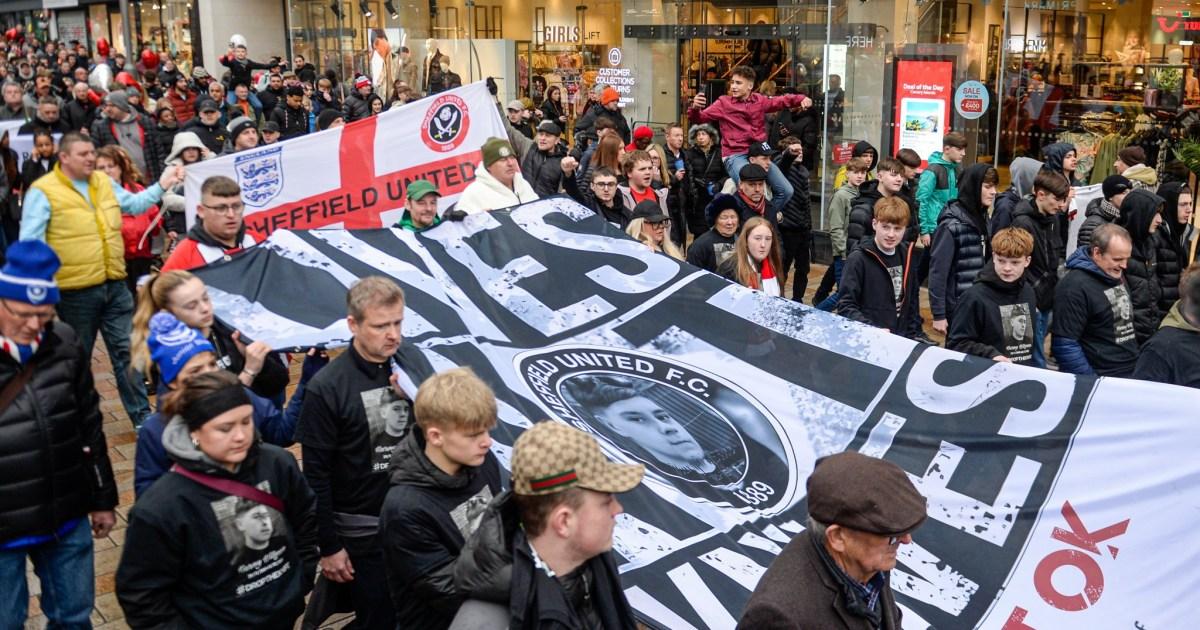 Hundreds of people joined them on the march which ended at Bramall Lane, home of Sheffield United, Harvey’s football team.