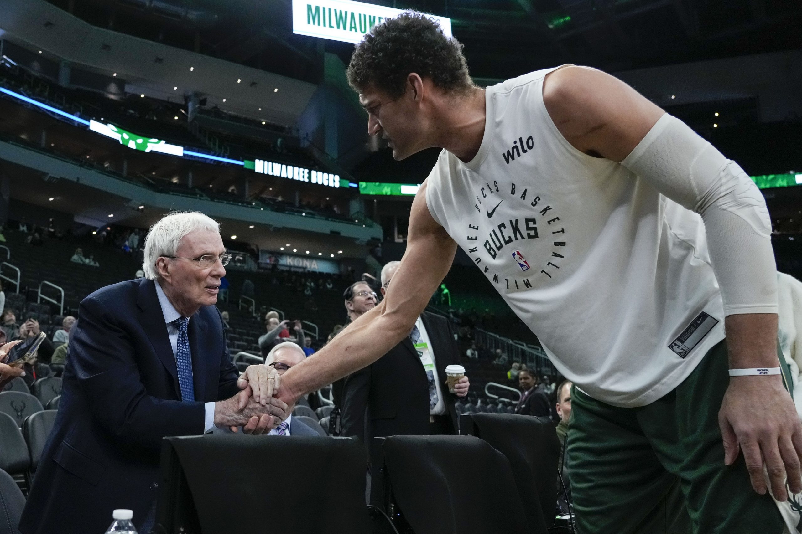 ESPN broadcaster Hubie Brown talks with Milwaukee Bucks center Brook Lopez (11) prior to the game against the Philadelphia 76ers at Fiserv Forum.