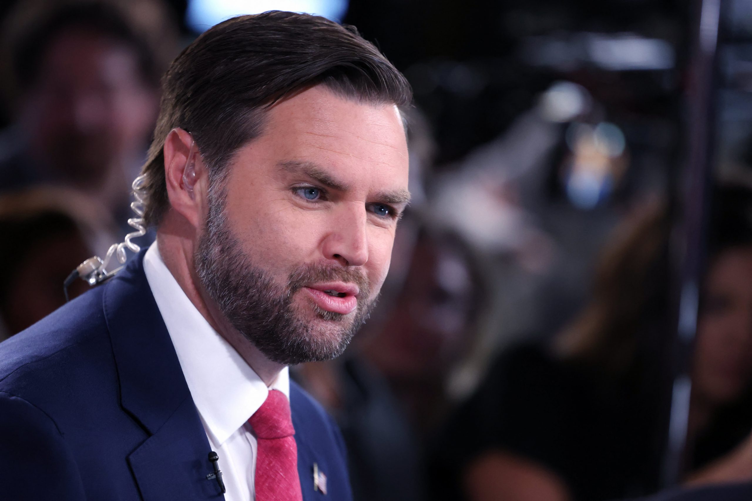 US Senator and Republican vice presidential candidate J.D. Vance speaks to a Fox News reporter in the spin room after participating in the Vice Presidential debate with Minnesota Governor and Democratic vice presidential candidate Tim Walz hosted by CBS News at the CBS Broadcast Center in New York on October 1, 2024.