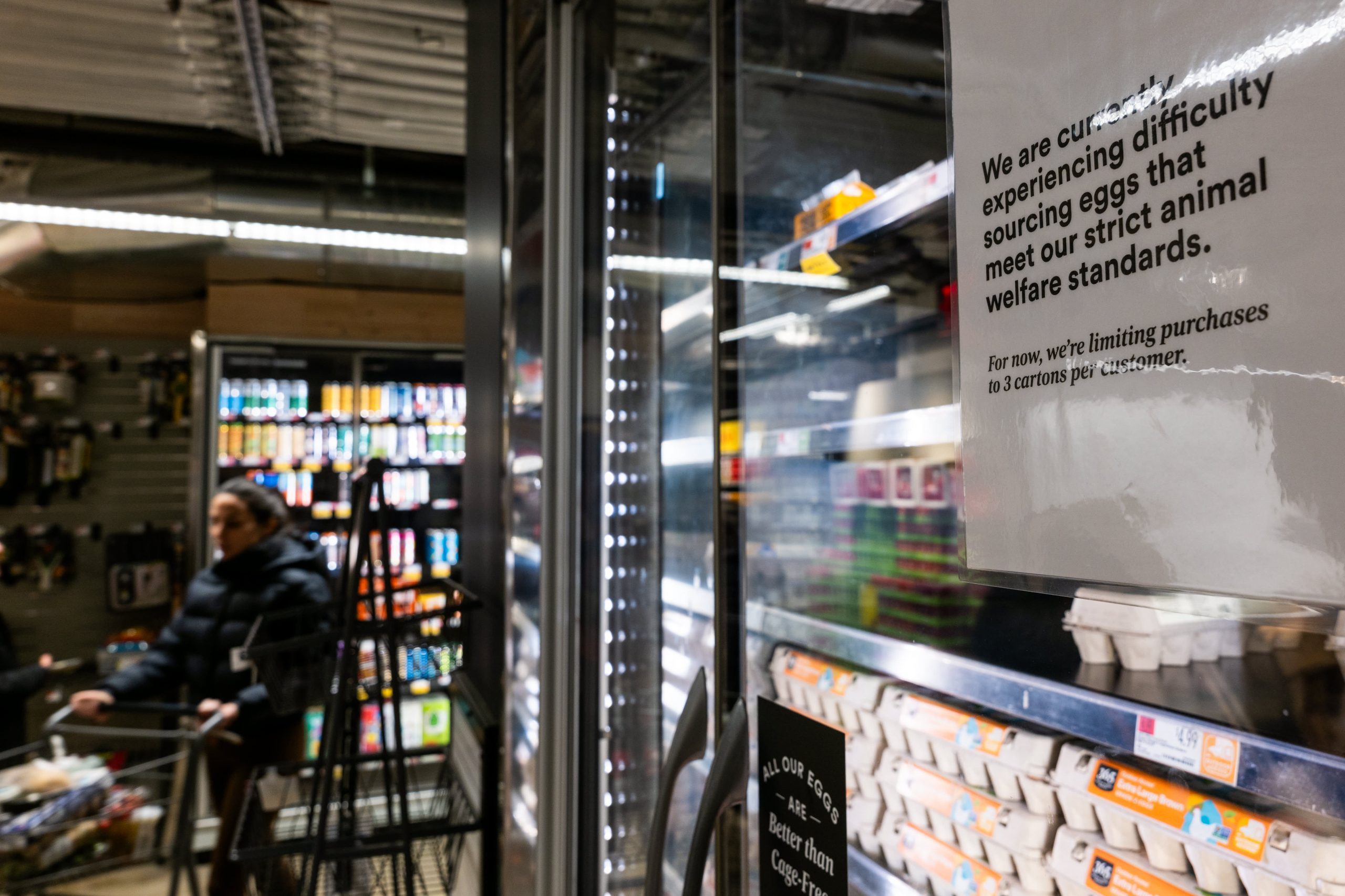 Cartons of eggs are displayed at a grocery store with a warning that limits will be placed on purchases as bird flu continues to affect the egg industry on Feb. 10, 2025 in New York City.