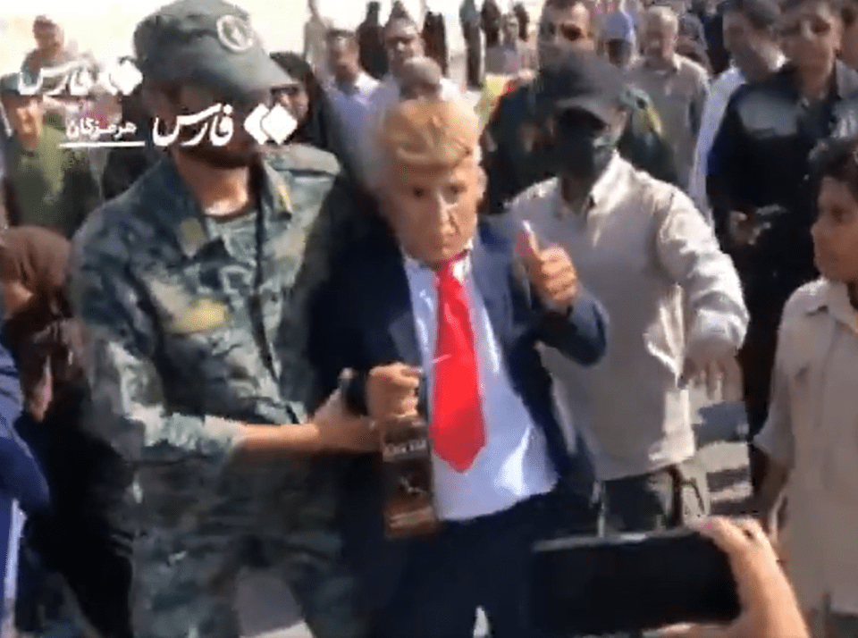 The propaganda video, shared by Iran’s state TV with ties to the Islamic Revolutionary Guard Corps (IRGC), also showed the Trump look-alike with what appears to be a liquor bottle.