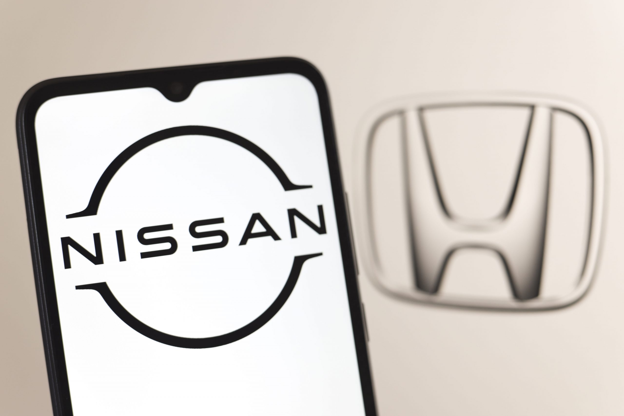 The Nissan logo appears on a smartphone screen, and in the background, the Honda Motor Company logo is visible in this illustration photo in Reno, United States, on December 26, 2024.