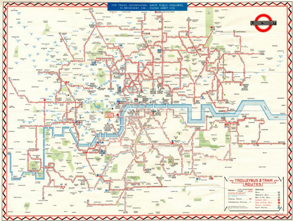 The 1946 map shows where the electric trolleybus and tram routes ran across London (Picture: London Transport Museum)