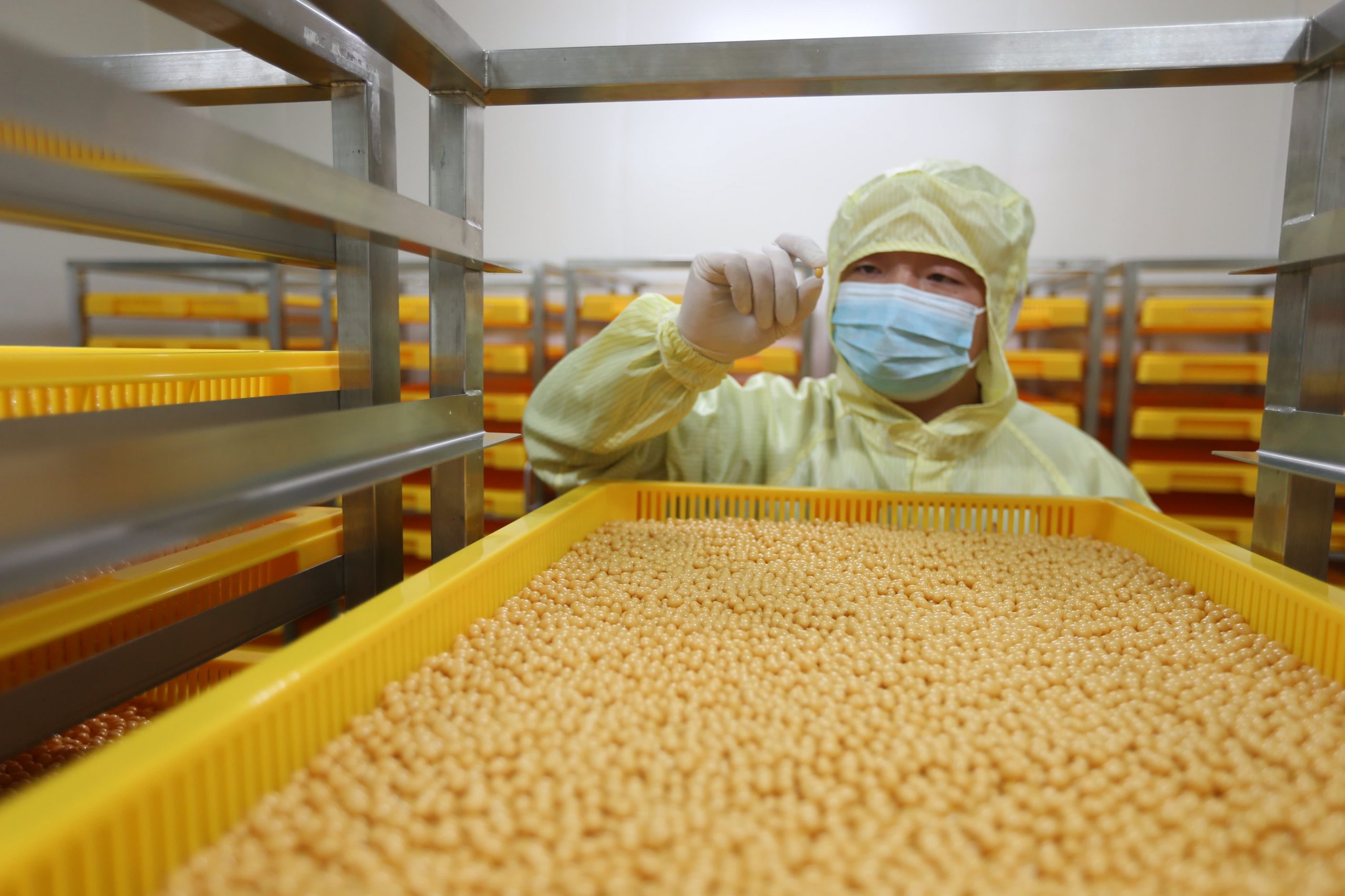 A worker is working on a drug production line at the production workshop of a pharmaceutical company in Meishan, China, on January 30, 2024.