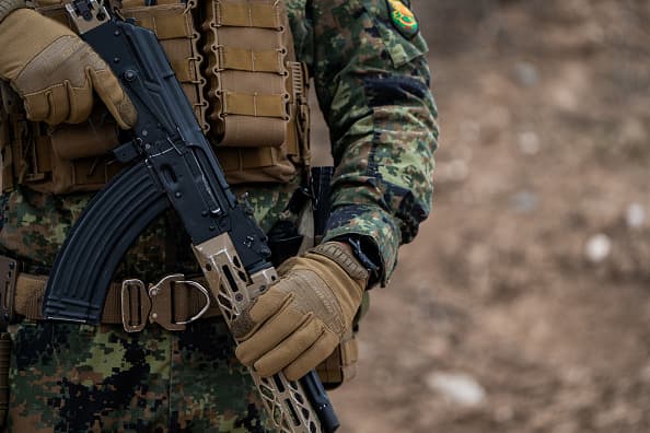 A detailed view as members of the Spain and Bulgarian armed forces take part during the NATO exercise Steadfast Dart on February 13, 2025 in Tsrancha, Bulgaria.