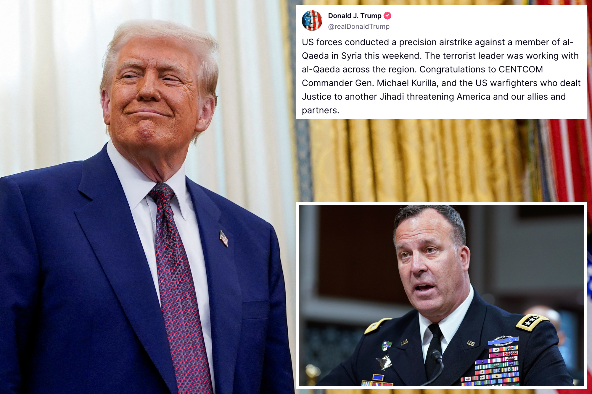 “US forces conducted a precision airstrike against a member of al-Qaeda in Syria this weekend,” Trump wrote on Truth Social. “The terrorist leader was working with al-Qaeda across the region.”