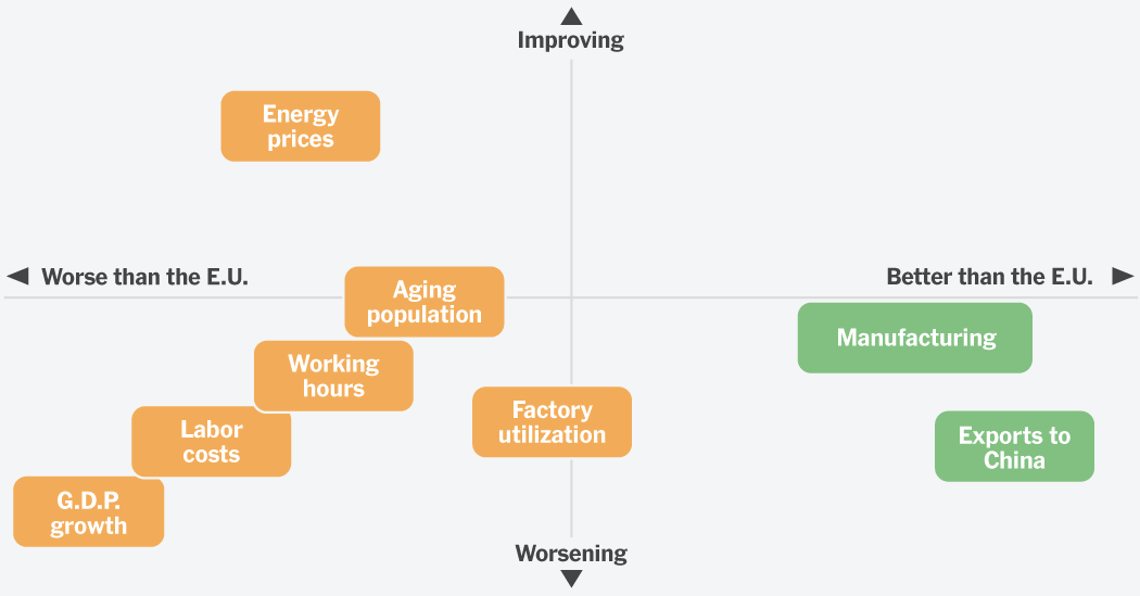 Along with high energy costs, economists and business leaders complain that characteristics of Germany’s labor pool put it at a disadvantage. German workers are more expensive than their counterparts across Europe, largely because hourly wages are significantly higher than in peer countries.