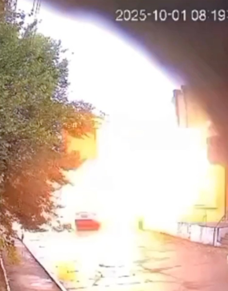 East2WestA security camera caught the blast as he got out of his car and walked into a building[/caption]
