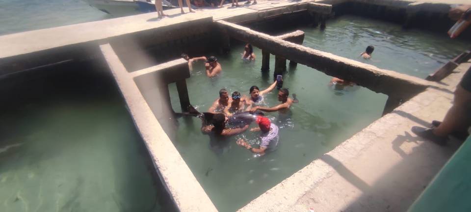 The horrifying incident unfolded inside a homemade elongated pool of fish tanks, where fee-paying tourists jump in to swim and touch the captive creatures.
