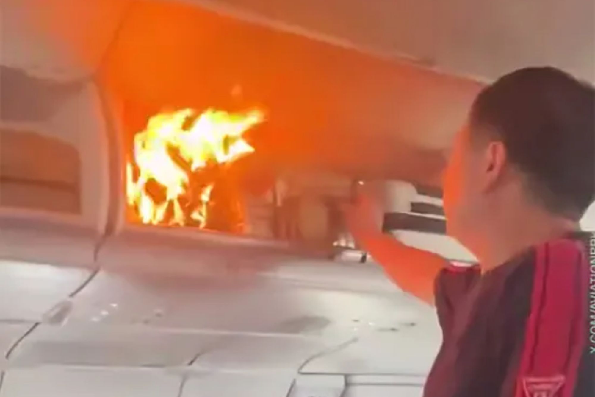 THIS is the moment orange flames burst from an overhead bin and thick smoke choked the cabin of an Air China jet, forcing an emergency landing. Dramatic footage from inside Flight CA139 shows passengers leaping from their seats as a fire suddenly erupts above them mid-flight. Grey smoke billows down into the aisle while bright…
