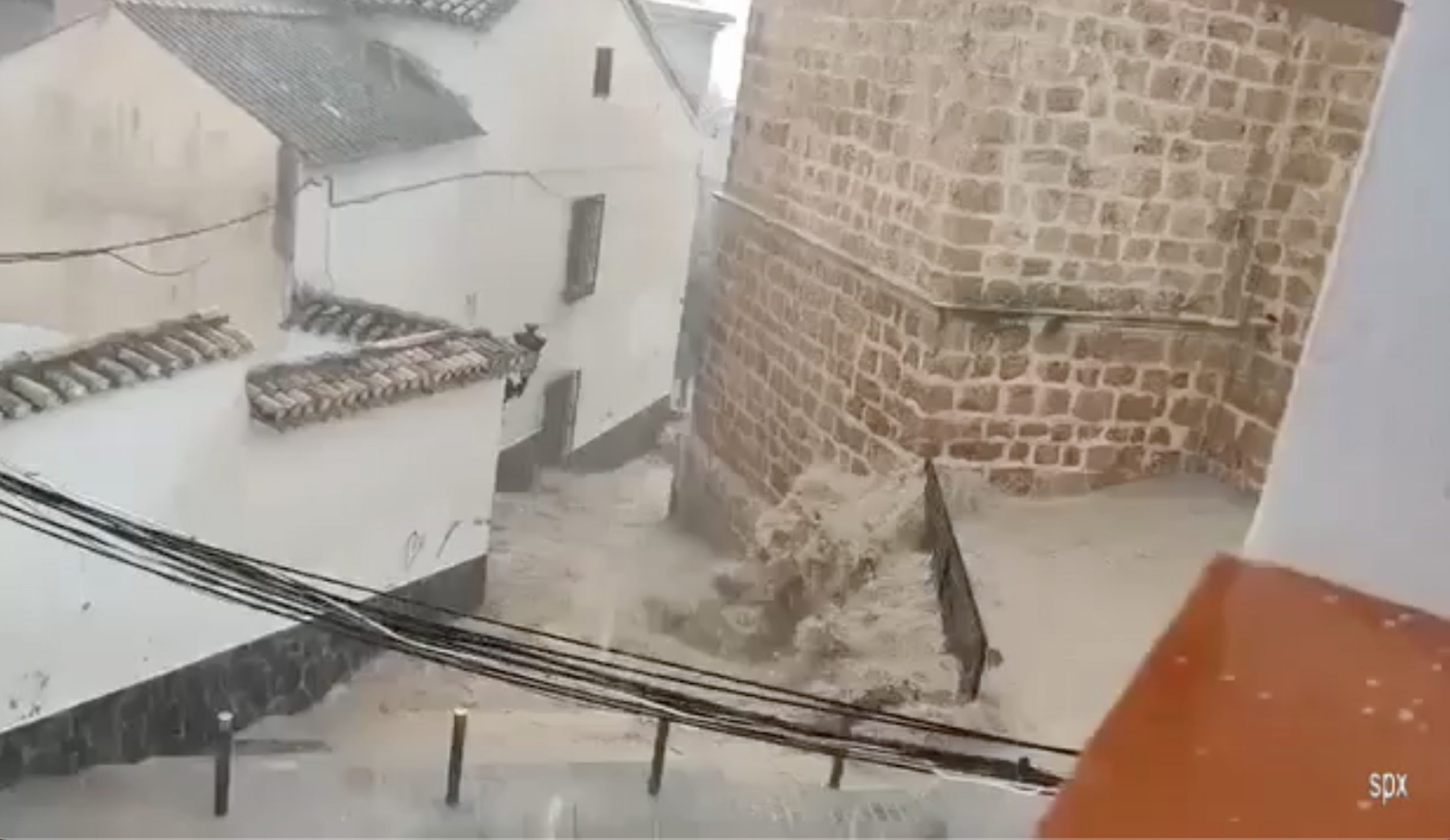 THIS is the moment a raging torrent left a trail of destruction as a sudden storm battered the popular Brit holiday hotspot of Granada. Dramatic clips posted online show torrents in Íllora surging past brick buildings and swirling around stranded vehicles, while onlookers watch from rooftops. One video captures how streets, cars and homes vanished…