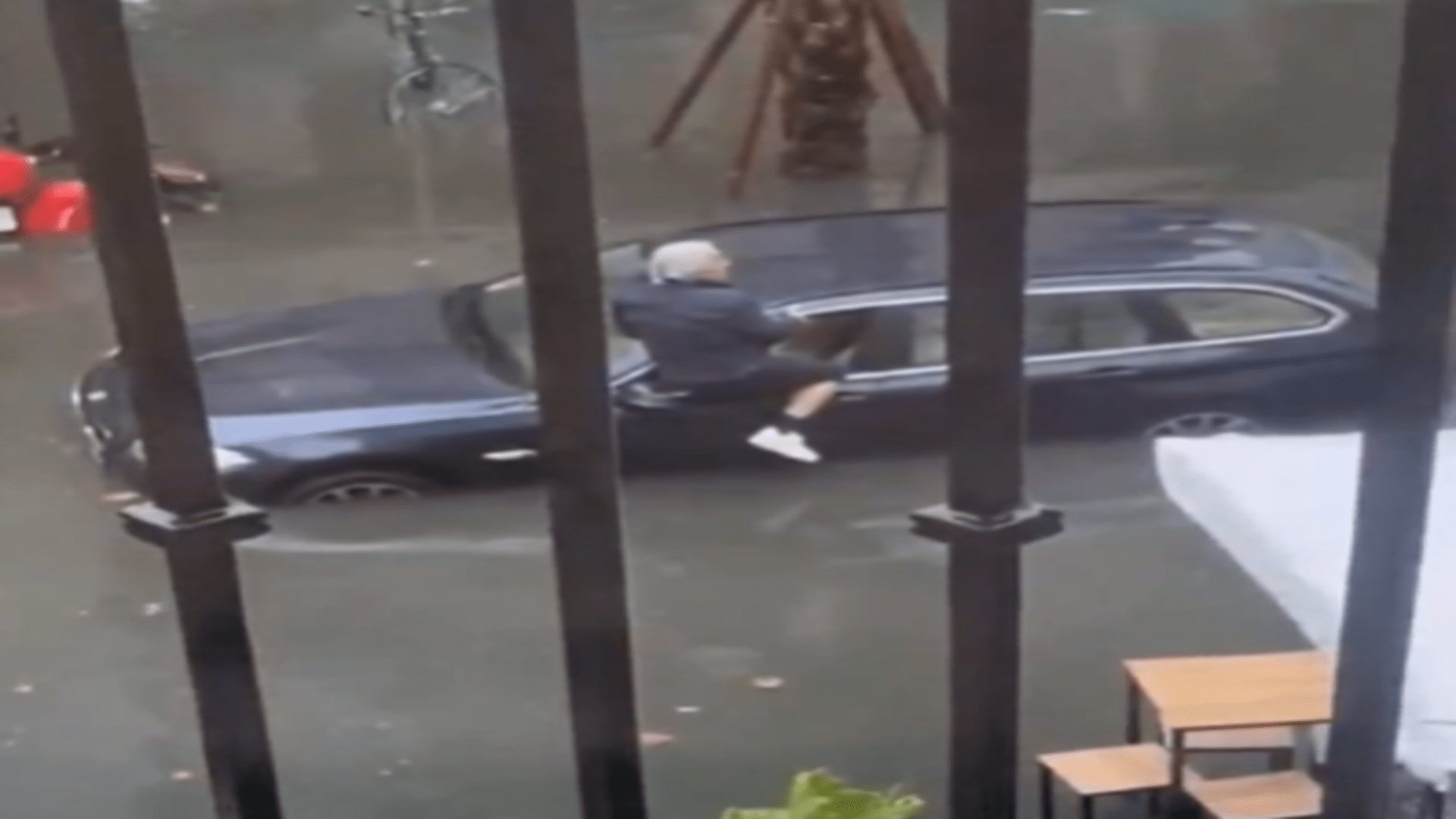 THIS is the moment a dramatic rescue attempt is carried out as man is saved from his flooded car. An elderly man can be seen leaning out the window of his vehicle as floodwaters rises to the wheel arches. A rescuer wades through knee-deep water to reach him, lifting the man onto his back and…