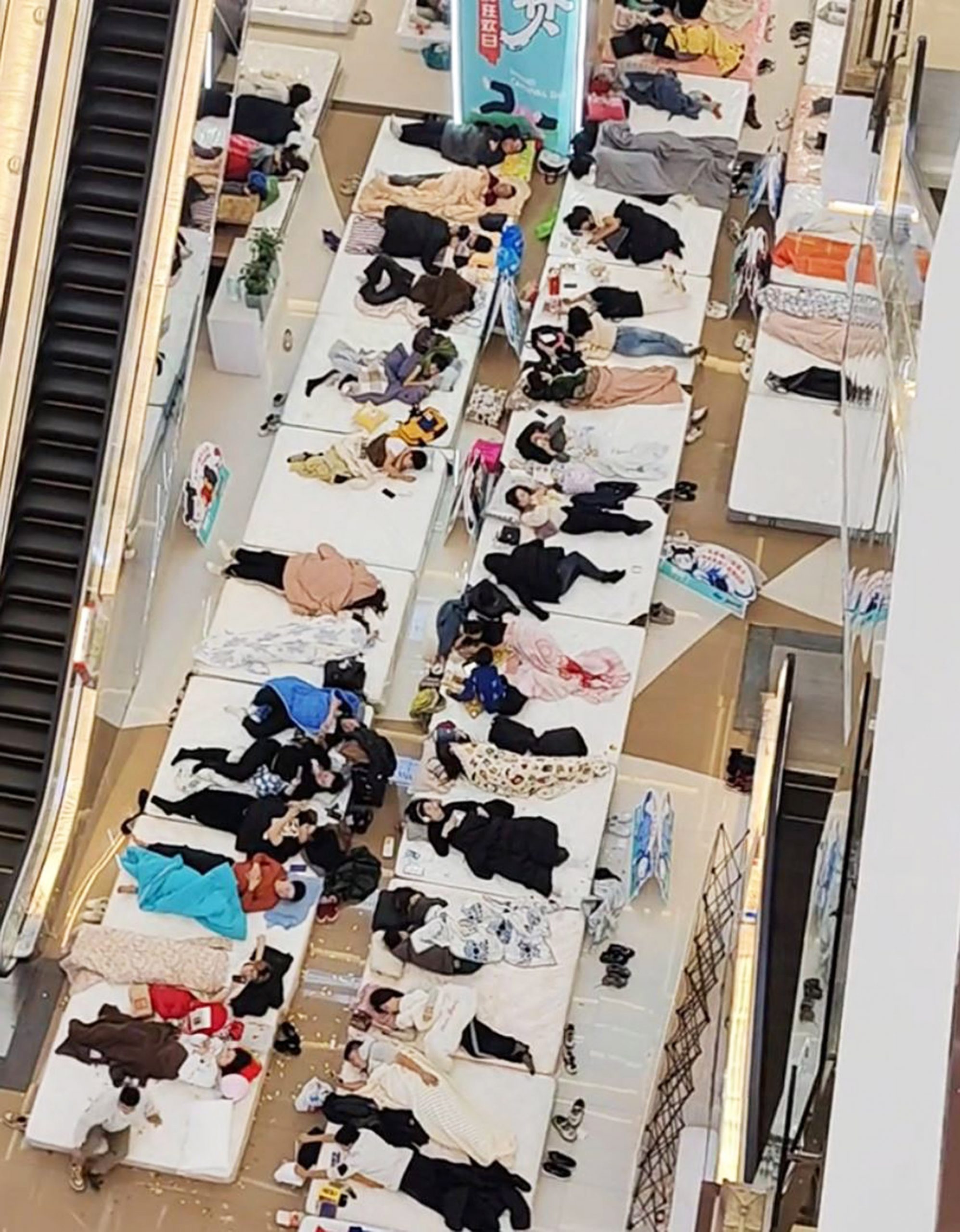 This is the bizarre moment dozens of nappy-clad contestants lie motionless on mattresses in a shopping centre as they compete in a “laziness” contest. Footage shows the hundreds of contestants slobbing around on mattresses surrounding an escalator. They could be seen tossing and turning as they were watched by the umpire, ensuring they weren’t breaking…