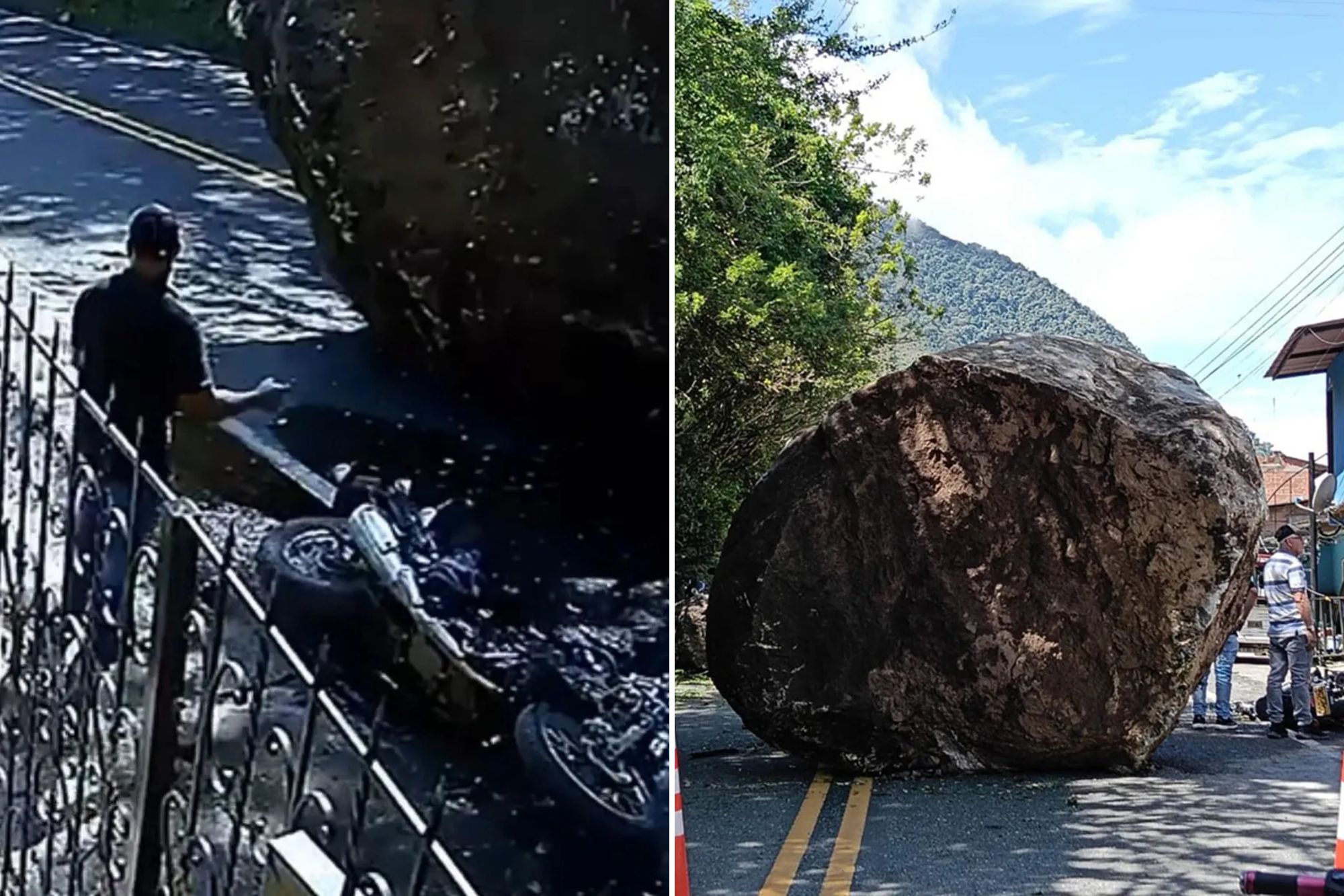 THIS is the terrifying moment a giant boulder plummets onto a main road, crushing a motorbike beneath it — yet the rider astonishingly walks away unscathed. The lucky biker narrowly escaped death in Colombia when a massive rock tumbled from the hill, smashing his bike beneath it. The incident took place in the municipality of…