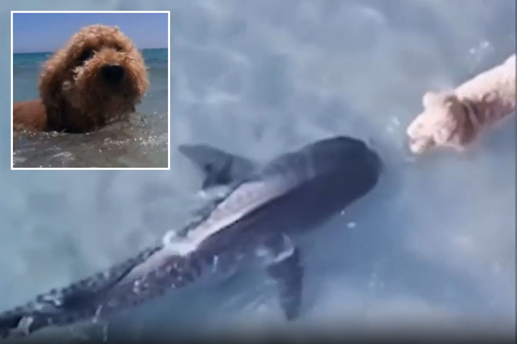 This is the horror moment a pooch diced with death as it came face-to-face with a massive tiger shark at a popular Australian beach. The dog’s owner could only watch helplessly from the shore as the deadly beast approached in the shallows at Whitford’s Dog Beach in Perth. Olive the Groodle was loving life, splashing in…