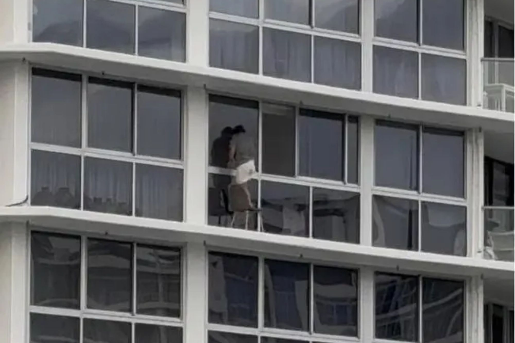 THIS is the jaw-dropping moment a woman precariously balanced high above the ground, cleaning her windows as horrified passersby watched in disbelief. Shocking footage shows the woman dicing with death as she perches on a narrow ledge of the 16th floor outside a Gold Coast apartment block. The resident of Peninsula Apartments on Clifford Street…