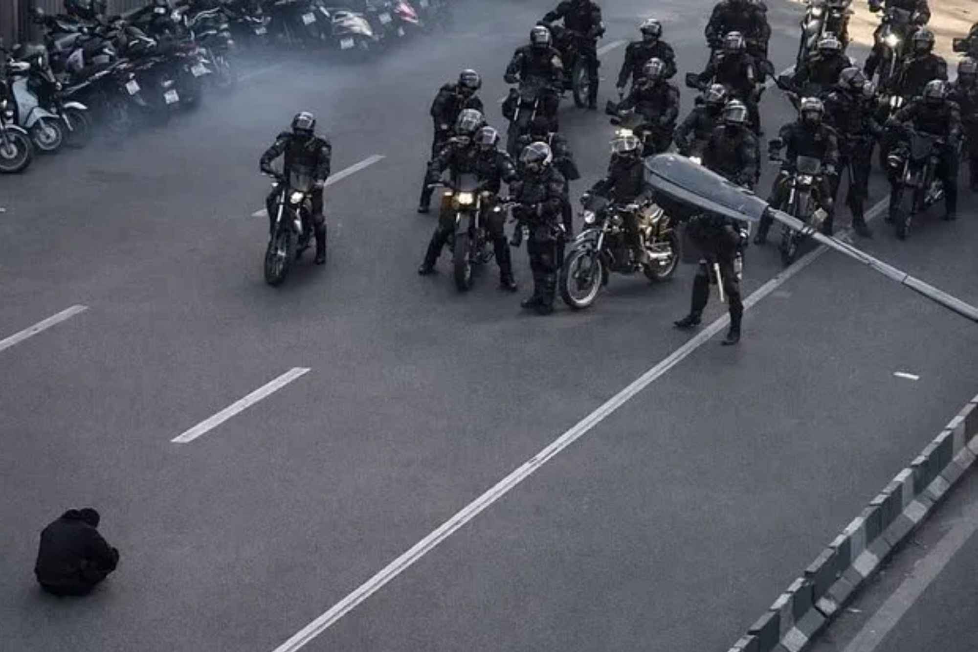 A STRIKING photo of a lone protester sitting defiantly in the road in front of armed security forces in Iran has sparked comparisons with the iconic ‘Tank Man’ image from the 1989 Tiananmen Square protests. The dramatic picture shows the demonstrator blocking armed police on motorbikes as unrest grips the country. Shared widely by local…
