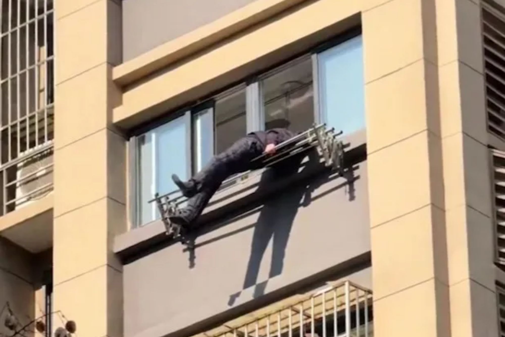 THIS is the shocking moment an elderly man is left dangling from a clothes drying rack, after falling from a 15th storey flat. The man, reportedly in his eighties, was left stunned when his terrifying fall was broken by the clothes rack on the seventh storey, saving him from plunging to his death. The man…