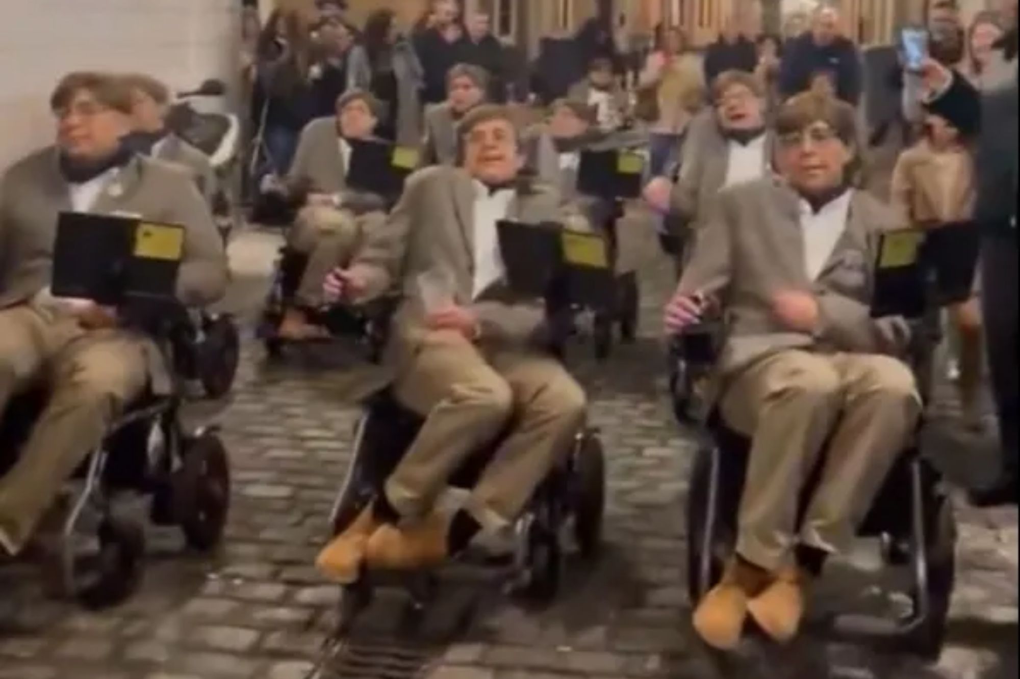 THIS is the bizarre moment a dozen carnival performers dress up as Stephen Hawking and belt out songs in robotic voices. The men wheeled down the streets of Cadiz wearing wigs and mimicking the late scientist’s posture. The men slumped back in electric wheelchairs, imitating the physicist. Video shows onlookers filming the men as they…