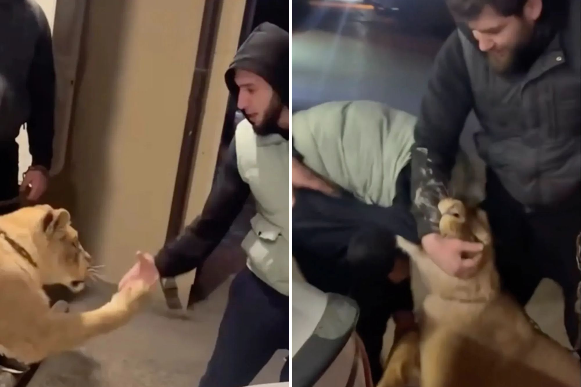 THIS is the terrifying moment a man was attacked by a pet lion after trying to shake the paw of the dangerous predator. Shocking footage shows a man approaching the beast being walked on a lead like a dog in Makhachkala, southern Russia. At first, the animal appears calm, almost bored, as the man edges…